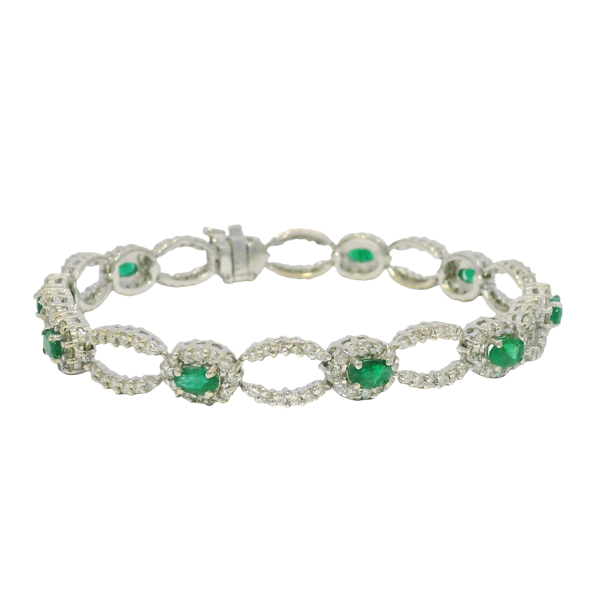 14k White Gold Natural Emerald & Diamond Open Link Bracelet