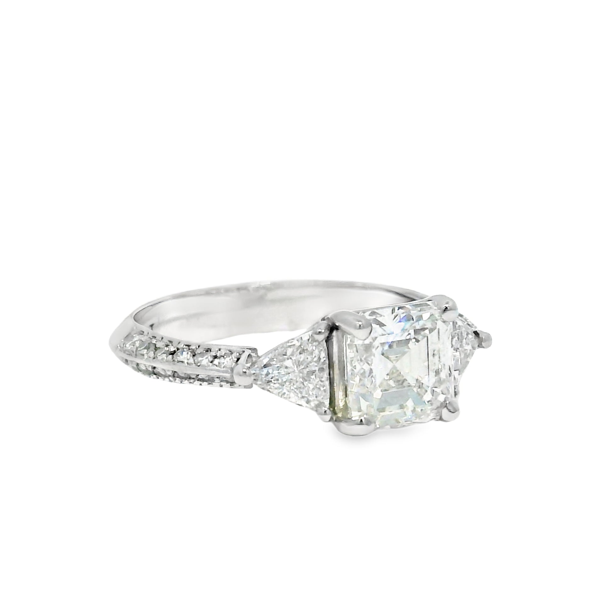 There are 2, natural, trillion cut diamonds along each side of the main diamond, weighing 0.50 carats total. There are an additional 0.24 carats of round brilliant cut diamonds on the mounting. The diamonds in the mounting are approximately G/H in color and SI in clarity. |